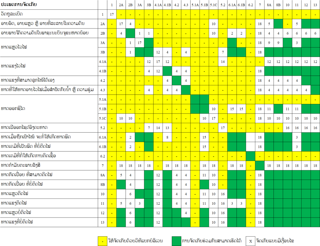 15. ການເກັບທາດອອກຊີໄດ ປະເພດ 5.1B ອາດຈະອະນຸຍາດໃຫ້ເກັບປະປົນກັບວັດຖຸອັນຕະລາຍປະເພດ 6.1A, 6.1B ໄດ້ ເຊີ່ງສາມາດເກັບໄດ້ປະລິມານສູງເຖິງ 20 ໂຕນ ໂດຍຕ້ອງມີມາດຕະການຄວາມປອດໄພດັ່ງນີ້: ອາຄານສາງສິນຄ້າຕ້ອງມີລະບົບເຕືອນໄພໄຟໄໝ້, ລະບົບມອດໄຟອັດຕະໂນມັດ ແລະ ທີມປະຈົນໄຟເຄີ່ງມືອາຊີບຂອງບໍລິສັດ (ພະນັກງານບໍລິສັດທີ່ເຮັດໜ້າທີ່ມອດໄຟຢ່າງດຽວພ້ອມມີລົດມອດໄຟຂອງບໍລິສັດ) ຖ້າມີທາດທີ່ບໍ່ຮອດ 1 ໂຕນ ບໍ່ຕ້ອງມີມາດຕະການເສີມດັ່ງກ່າວ.