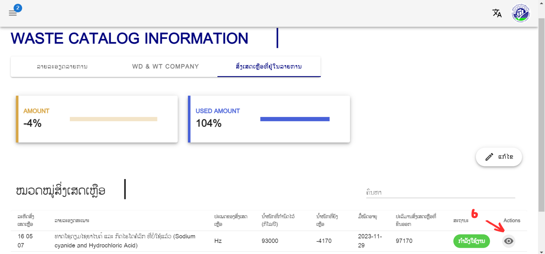 4. ກົດປຸ່ມ ຮູບຕາ ທີ່ລາຍການສິ່ງເສດເຫຼືອ ທີ່ຕ້ອງການເພີ່ມປະລິມານສິ່ງເສດເຫຼືອ ຕົວຢ່າງຕ້ອງການເພີ່ມປະລິມານສິ່ງເຫຼືອປະເພດເປັນພິດອັນຕະລາຍ ກໍ່ໃຫ້ກົດທີ່ລາຍການສິ່ງເສດເຫຼືອເປັນພິດອັນຕະລາຍ