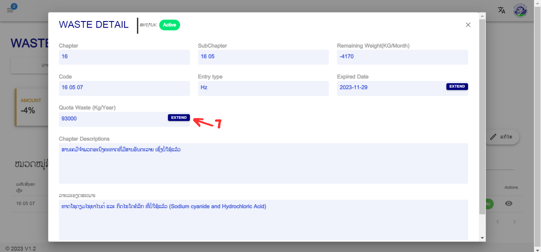 7. ກົດປຸ່ມ “Extend” ໃນຊ່ອງຂອງ Quota Waste (Kg/year)