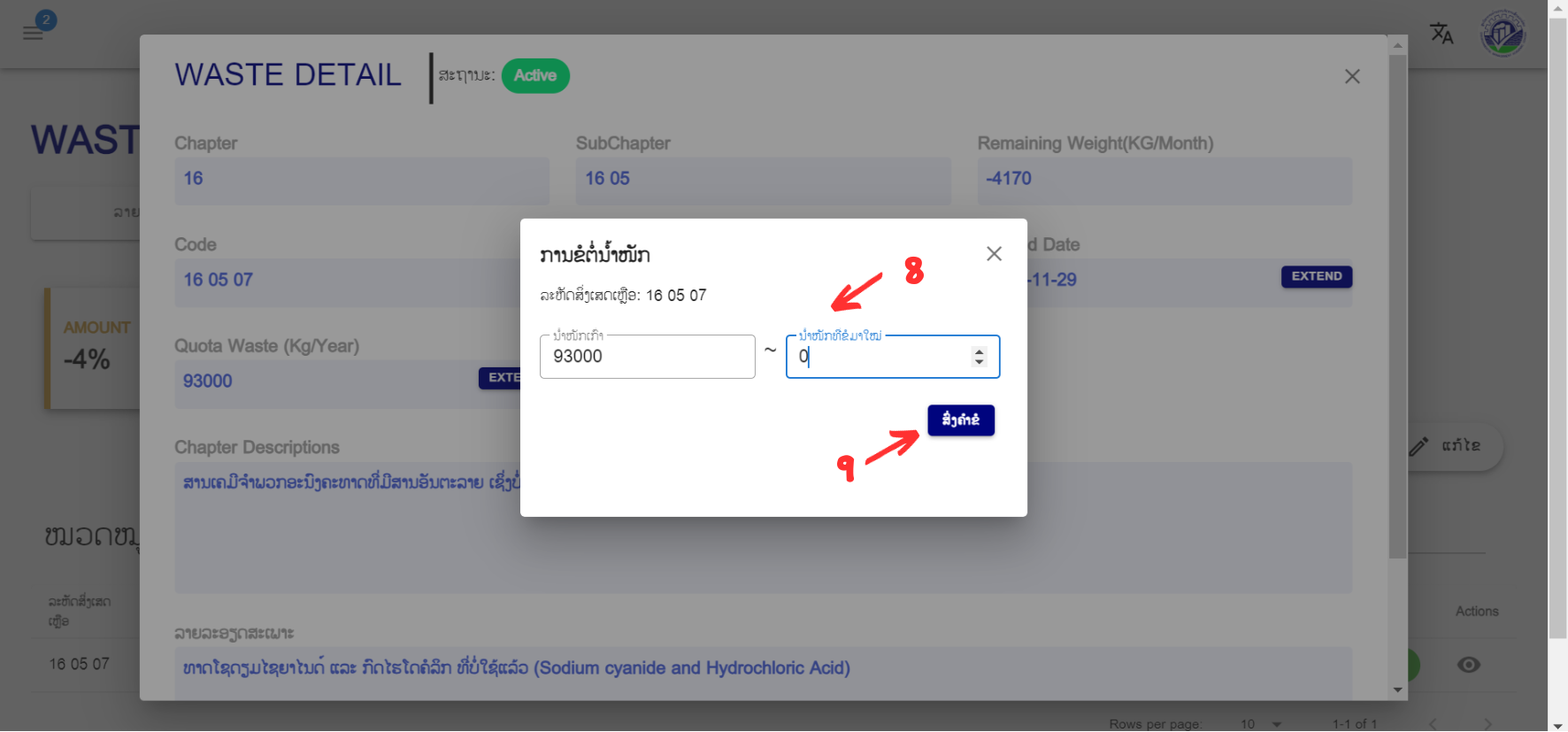 ຜູ້ສ້າງສິ່ງເສດເຫຼືອ (WG) ສາມາດເພີ່ມປະລິມານສິ່ງເສດເຫຼືອໃນລາຍການ (Extend the quota) ຕາມຂັ້ນຕອນດັ່ງຕໍ່ໄປນີ້: